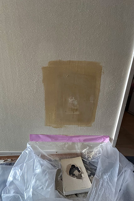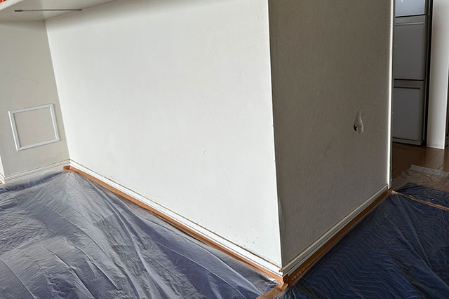穴修理作業前に毛布養生にビニール養生を行って石膏ボードの粉や埃が付かないように念入りに行います。